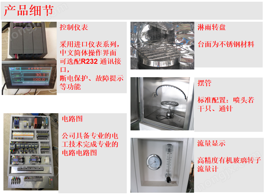 8、喷嘴:根据试件的大小,箱体的内容积决定摆管的弯曲半径。喷嘴为可折式专用喷嘴,喷孔可根据标准要求的孔径随时更换,可调节喷水方向,使射出的水滴均匀,流量充足
